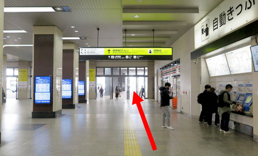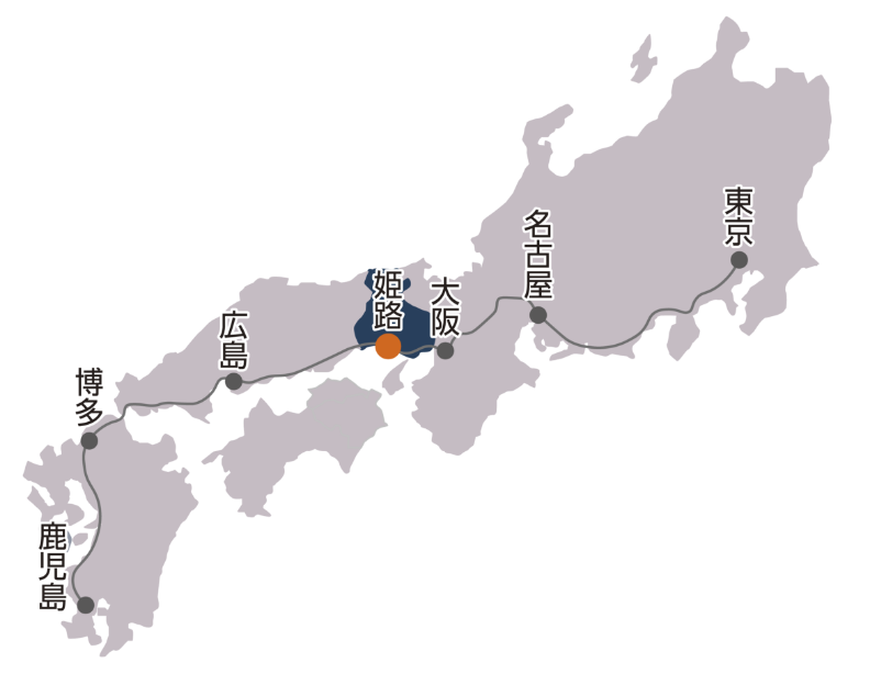 - ・大阪方面から約60分・・・新快速:大阪駅→(20分)→三ノ宮駅→(40分)→姫路駅