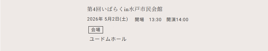 Eventsイベント 1/5(月)10:00~チケット一般発売 料 金: 指定席 3,500円 申込方法: ① 以下の水戸市民会館チケット予約サイトよりお申し込みください。 ② チケット予約サイトでのお申し込みが難しい方は、窓口や電話予約でも受け付けております。 ●窓口でのチケット発売● 平日9:00-20:00 土日祝日9:00-17:00 ●お電話でのチケット発売● お問い合わせ: 029-350-6060 受付時間:平日9:00-20:00 土日祝日9:00-17:00 リーフレット