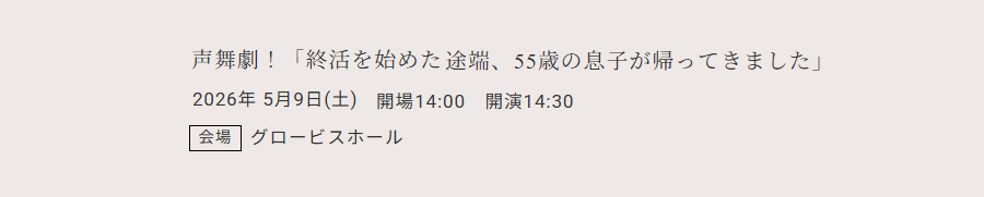 Eventsイベント 1/10(土)10:00~チケット一般発売 料 金: 全席指定 8,000円 申込方法: ① 以下の水戸市民会館チケット予約サイトよりお申し込みください。 ② チケット予約サイトでのお申し込みが難しい方は、窓口や電話予約でも受け付けております。 ●窓口でのチケット発売● 平日9:00-20:00 土日祝日9:00-17:00 ●お電話でのチケット発売● お問い合わせ: 029-350-6060 受付時間:平日9:00-20:00 土日祝日9:00-17:00 注意事項: ※未就学児の入場はご遠慮下さい。 ※枚数制限:4枚まで ※ご予約後の変更、キャンセルはできません。 ※車椅子席はキョードーファクトリーチケットセンターでのみの取り扱いとなります。キョードーファクトリーチケットセンター(0570-025-500)までお問合せください。