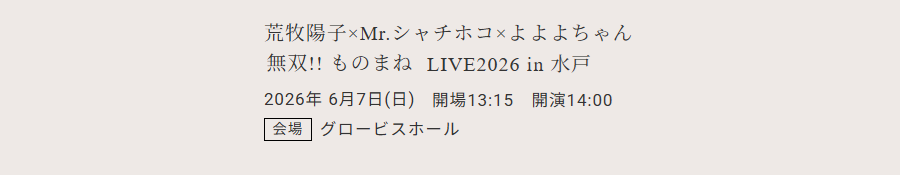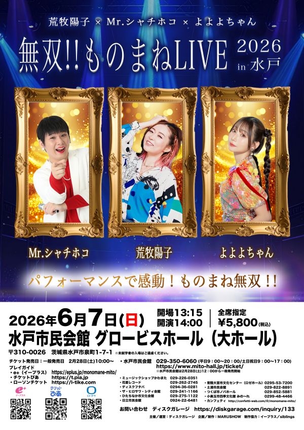 Eventsイベント 2/28(土)12:00~チケット一般発売 料 金: 全席指定 5,800円 申込方法: ① 以下の水戸市民会館チケット予約サイトよりお申し込みください。 ② チケット予約サイトでのお申し込みが難しい方は、窓口や電話予約でも受け付けております。 ●窓口でのチケット発売● 平日9:00-20:00 土日祝日9:00-17:00 ●お電話でのチケット発売● お問い合わせ: 029-350-6060 受付時間:平日9:00-20:00 土日祝日9:00-17:00 注意事項: ※未就学者の入場はご遠慮ください。 ※枚数制限:4枚まで ※ご予約後の変更、キャンセルはできません。