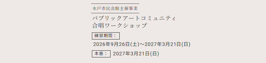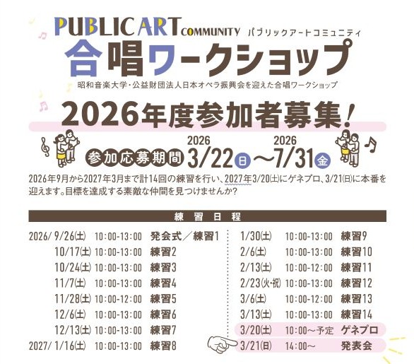 2027年3月20日(土)10:00~のゲネプロ・3月21日(日)の本番に必ず参加できる方。 本番除く10回以上の練習に参加できる方。 |