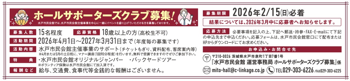 〒310-0026 茨城県水戸市泉町1丁目7番1号 「水戸市民会館 運営委事務局 ホールサポーターズクラブ募集」係 |
