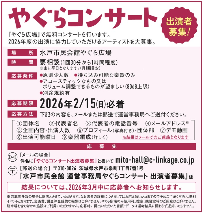 件名に「やぐらコンサート出演者募集」と書いて、 mito-hall@c-linkage.co.jp |